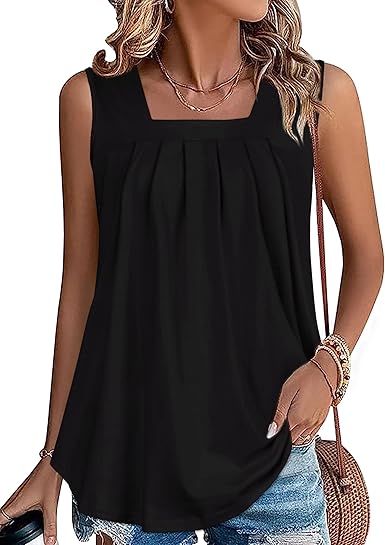 Womens Tank Tops Summer Square Neck Pleated Sleeveless Top Casual Loose Fit Basic Shirts